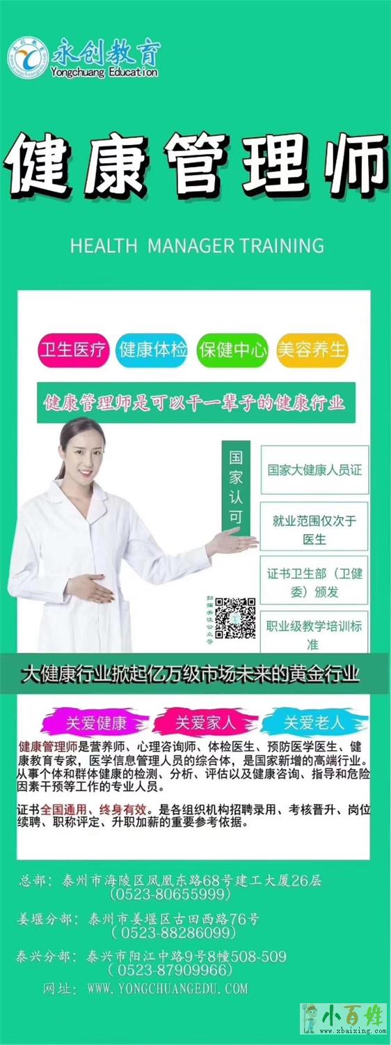 国家卫生行业健康管理师职业资格证书具有职业鉴定法律效力,是健康管理从业的凭证,是健康管理求职、任职、录用的依据之一小.百.姓.网。全国认可,全国通用,终身有效,无需年检来自www.xbaixing.com。